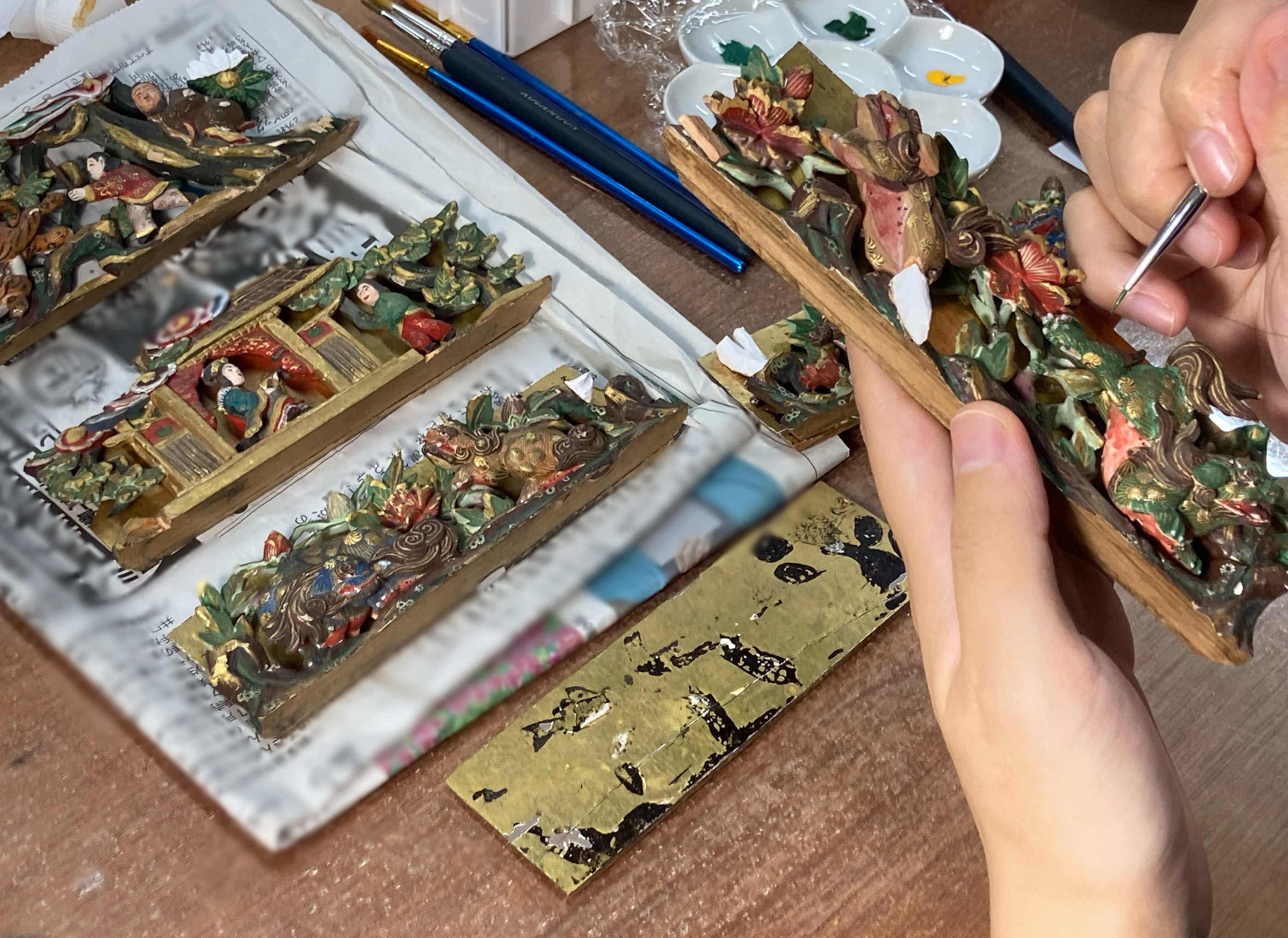 漆塗り職人を「塗師(ぬし)」と言います。匠工房 こいちは漆塗りをする塗師屋さんなのですが、この写真の作業は漆塗りではなく、「彩色(さいしき)」というものです。「彩色」とは平たく言うと、木地や金箔の上に、岩絵の具という絵の具を使って絵を描いたり色をつけたりすることです🌸
